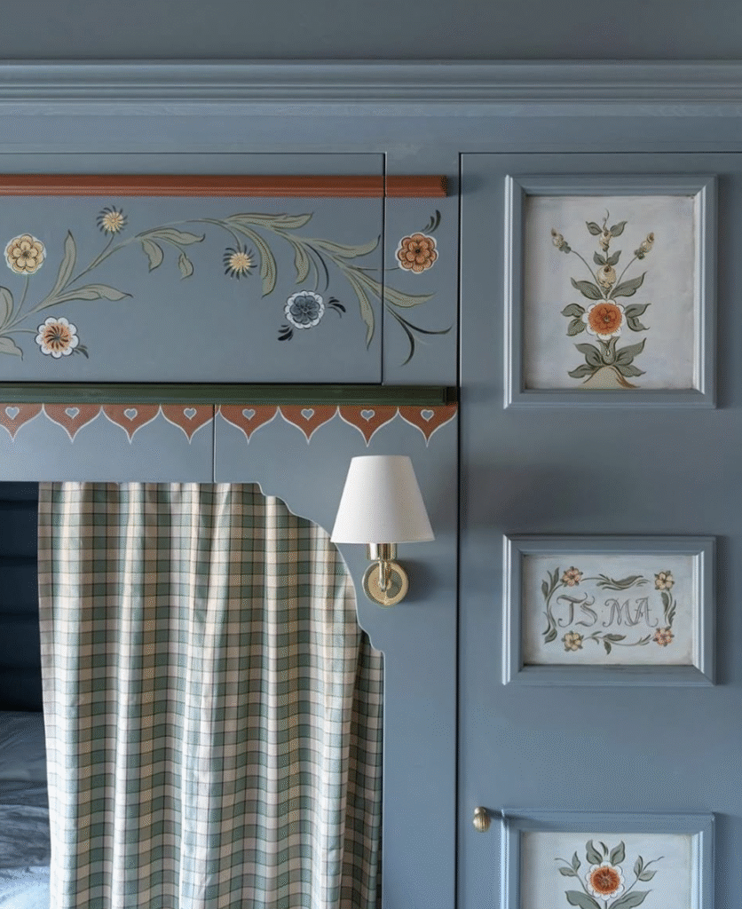 Today, we’re diving into a topic that I lightly touched on earlier this year, in a team shopping post about what we were on the hunt for in our homes in 2025: folk art. In it, I explained that I would love to stumble upon a Scandinavian hand-painted folk art dresser or chest for my daughter’s bedroom, as she absolutely adores the “Frozen” movies. When I was first introduced to Anna and Elsa a decade ago, I didn’t even notice all the gorgeous painted scrollwork and florals adorning millwork, doors, walls, and textiles. But after seeing the films enough to have them imprinted in my veins, it’s what I enjoy most about the visuals.
