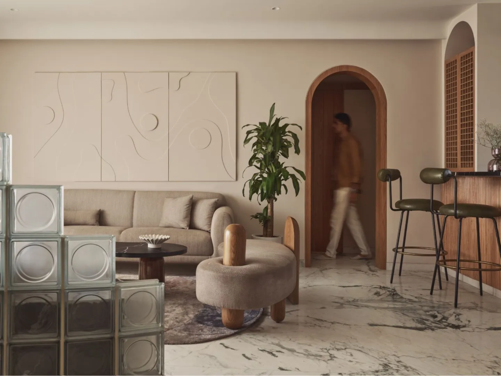 - Curved Furniture: Think rounded sofas, “bean” shaped coffee tables, and circular armchairs. These shapes mimic the fluidity of nature and encourage a more social, dynamic flow in your living room.
