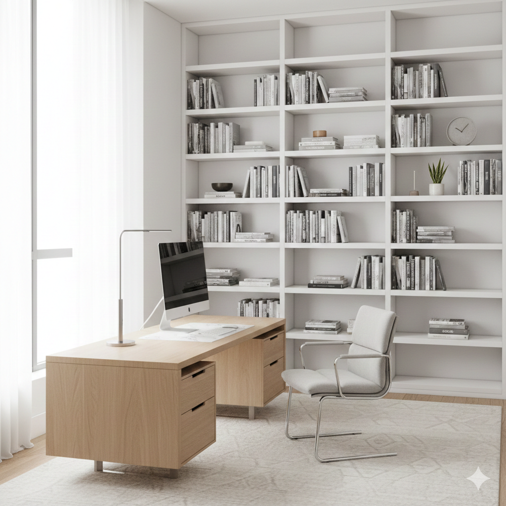 The Hidden Desk: If your office is part of a multi-purpose room, consider a “floating desk” or a sleek writing bureau. This keeps the room looking like a home while providing a dedicated professional zone.